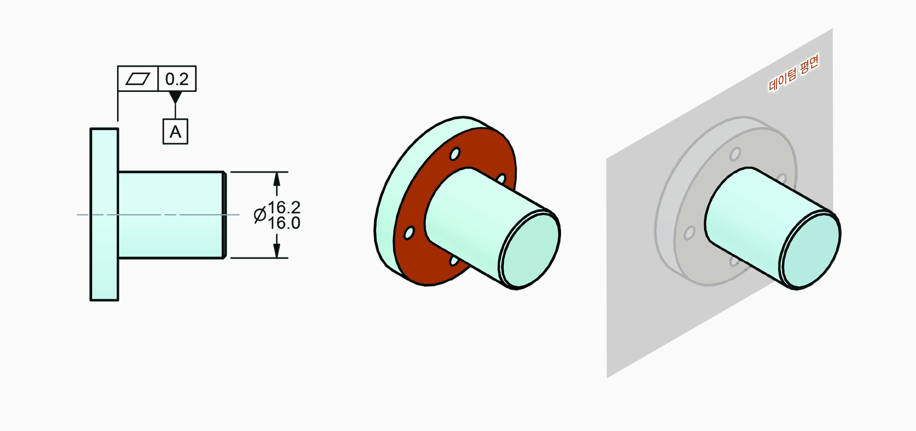 왼쪽 그림은 데이텀 피쳐 심볼이 부품의 플랜지 뒷면을 통제하는 평면공차에 연결되어 있고, 오른쪽 그림은 부품의 외경면을 정의하는 사이즈 치수에 연결되어 있다.