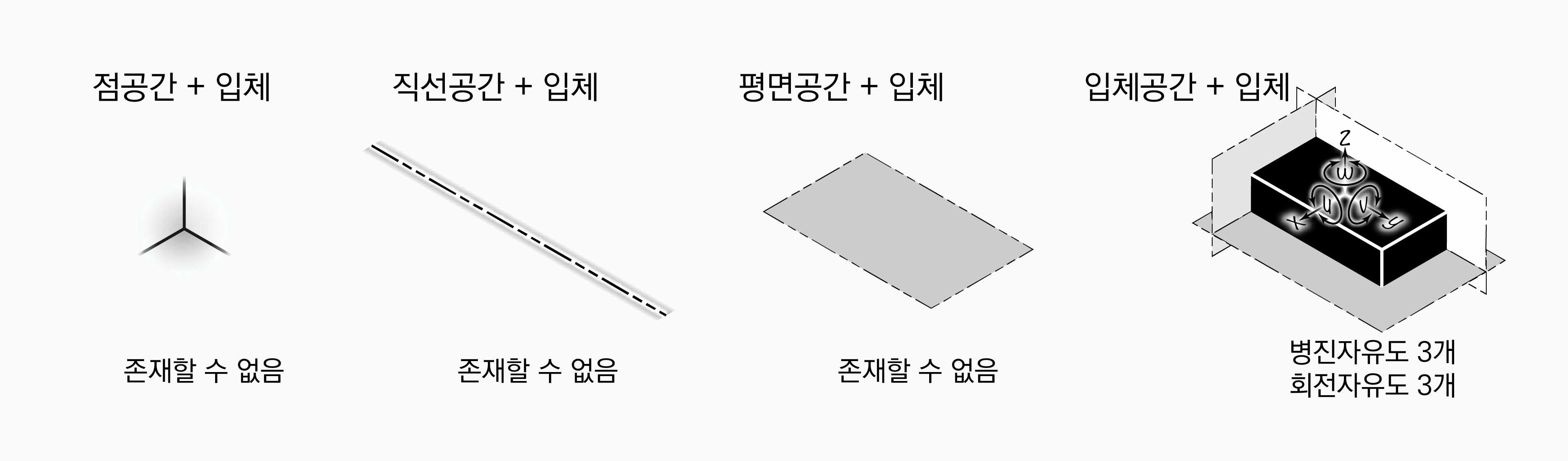 도형은 자신의 차원보다 낮은 차원의 공간에 있을 수 없다. 따라서 입체는 점공간, 직선공간, 평면공간에 있을 수 없다. 입체는 3개의 병진자유도와 3개의 회전자유도를 가진다. 입체가 입체공간에 있다면, 입체는 입체공간에서 세 방향으로 평행이동할 수 있고, 세 방향으로 회전이동할 수 있다. 따라서 병진자유도 3개와 회전자유도 3개가 생긴다.