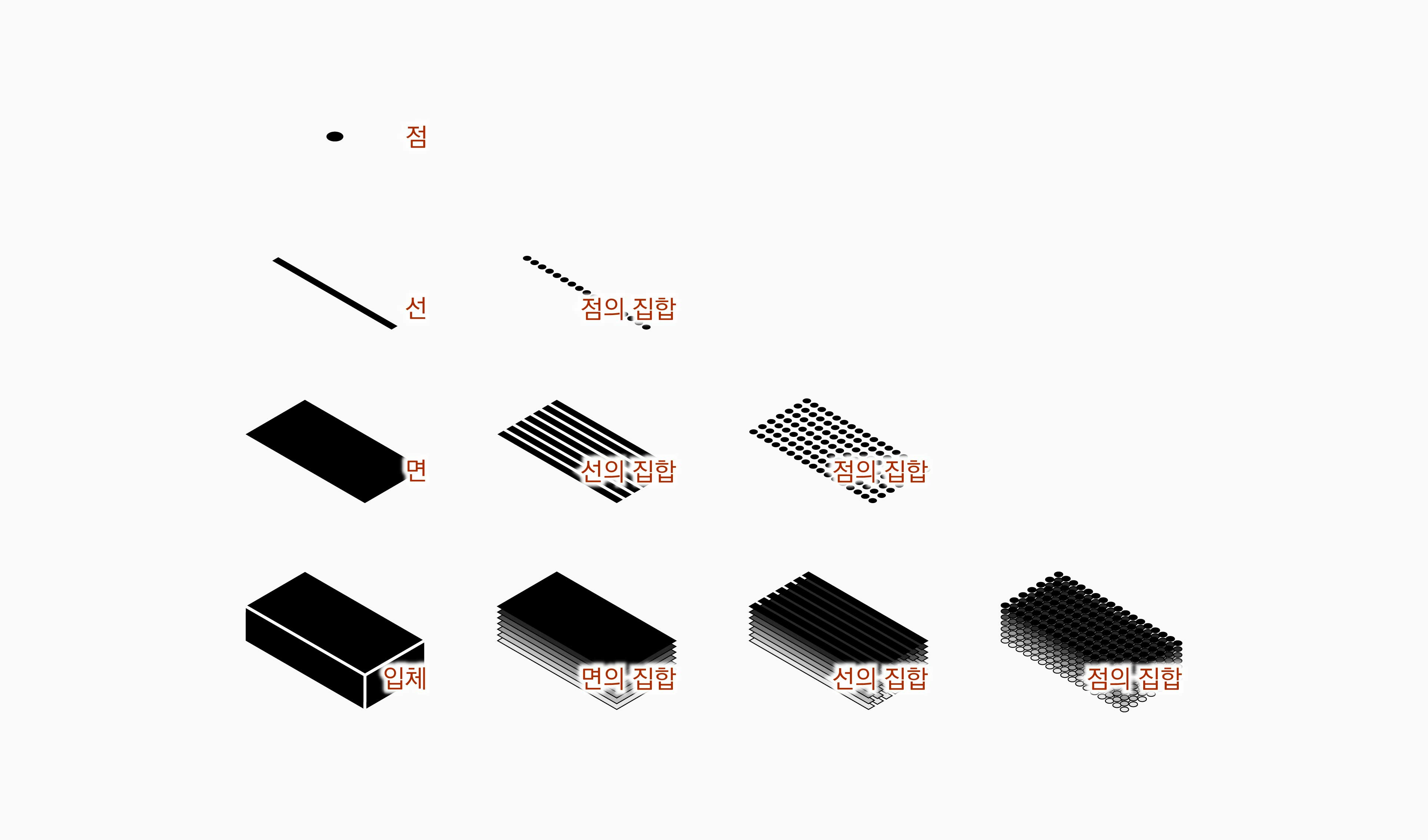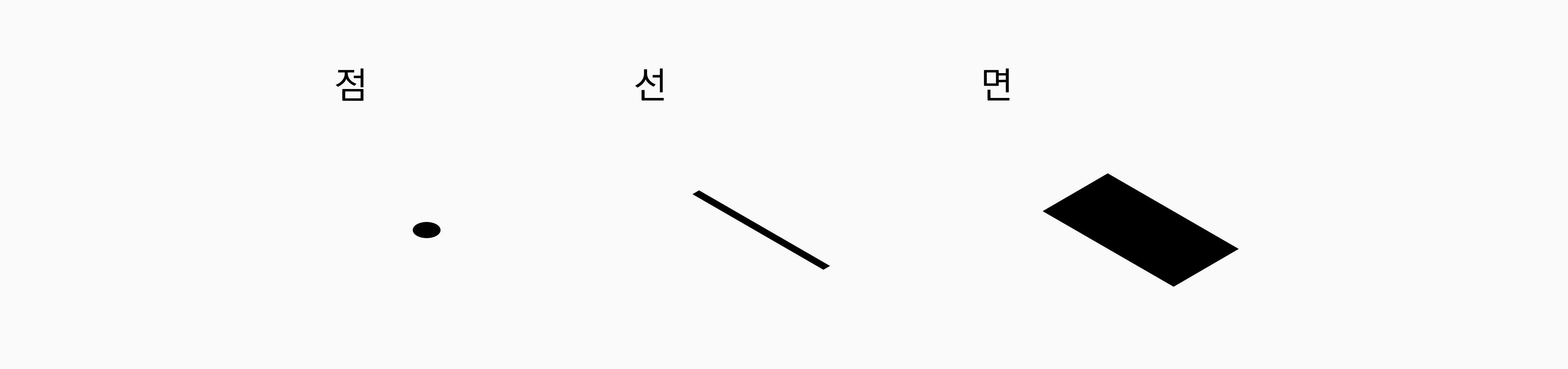 그래도 점, 선, 면에 대해 계속 논의를 해보자. 점이 모여서 선이 되고, 선이 모여서 면이 되고, 면이 모여서 입체가 된다.