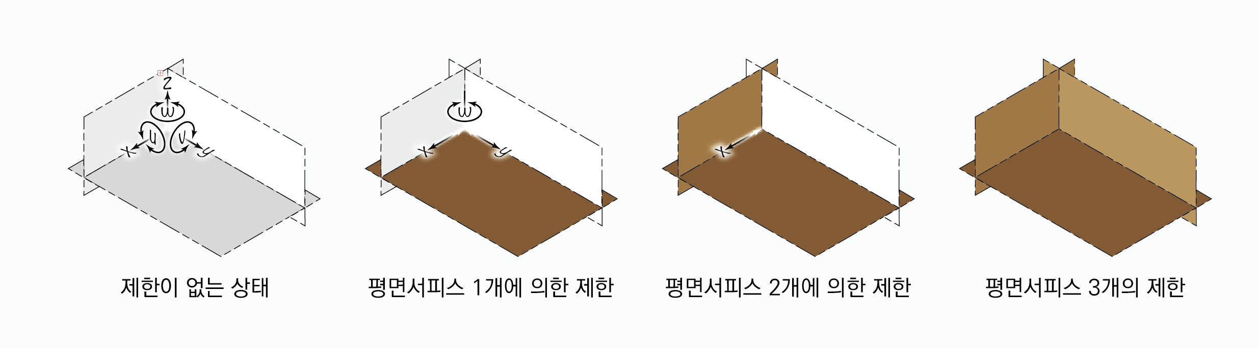 간단하게 설명하면, 평면서피스 하나를 데이텀 피쳐로 참조하면, 공차영역이 있는 공간은 6개의 자유도 중 병진자유도 1개와 회전자유도 2개가 제한된다. 따라서 공차영역은 병진자유도 2개와 회전자유도 1개만 생긴다. 평면서피스를 하나 더 데이텀 피쳐로 참조하면, 공차영역이 있는 공간은 병진자유도 2개와 회전자유도 1개가 더 제한된다. 추가로 제한되는 병진자유도 1개는 앞서 제한된 병진자유도 1개와 중복되기 때문에 결과적으로 병진자유도 1개와 회전자유도 1개가 더 제한되어, 결과적으로 병진자유도 2개와 회전자유도 2개가 제한된다.
