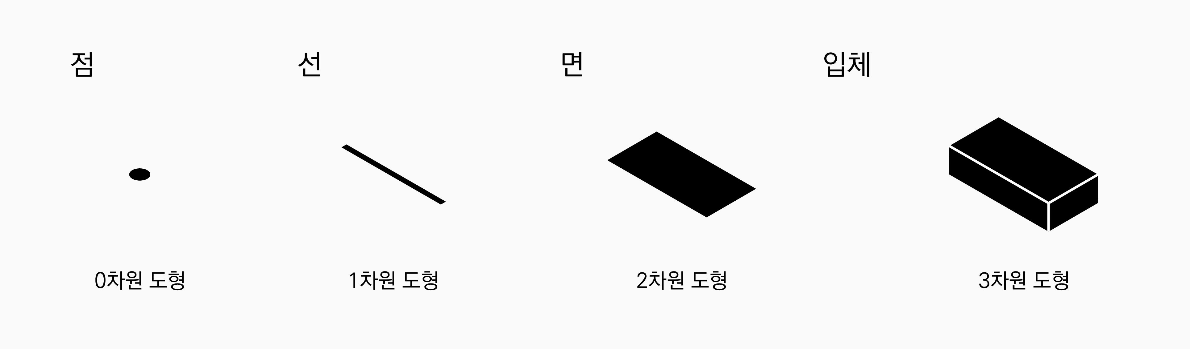 도형은 차원에 따라 그림과 같이 구분할 수 있다. 점은 0차원 도형이다. 선은 1차원 도형이다. 면은 2차원 도형이다. 입체는 3차원 도형이다.