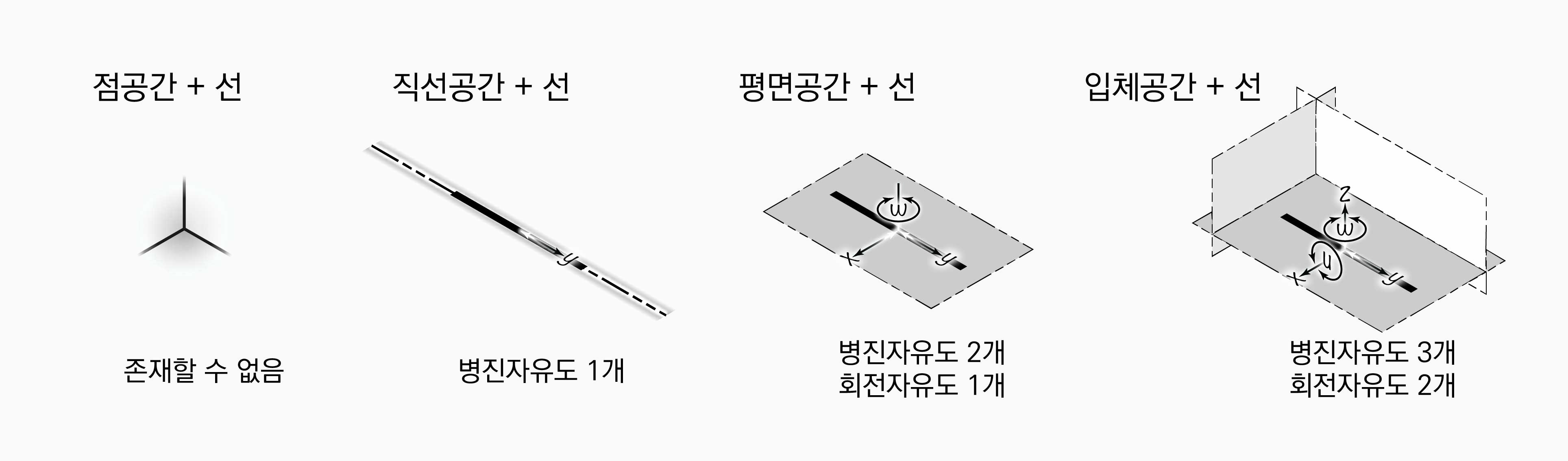 도형은 자신의 차원보다 낮은 차원의 공간에 있을 수 없다. 따라서 선은 점공간에 존재할 수 없다. 선은 3개의 병진자유도와 2개의 회전자유도를 가진다. 그러한 선이 직선공간에 있다면, 선은 직선을 따라 한 방향으로만 평행이동할 수 있다. 따라서 병진자유도 1개만 생긴다. 선이 평면공간에 있다면, 선은 평면공간에서 두 방향으로 평행이동할 수 있고, 한 방향으로 회전이동할 수 있다. 따라서 병진자유도 2개와 회전자유도 1개가 생긴다. 선이 입체공간에 있다면, 선은 입체공간에서 세 방향으로 평행이동할 수 있고, 세 방향으로 회전이동할 수 있다. 따라서 병진자유도 3개와 회전자유도 2개가 생긴다.