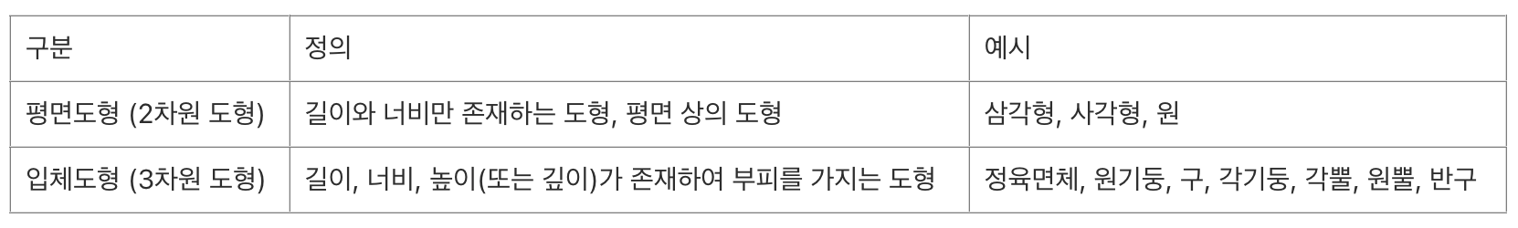 2차원 도형은 평면도형으로 3차원 도형은 입체도형으로 부르기도 한다.